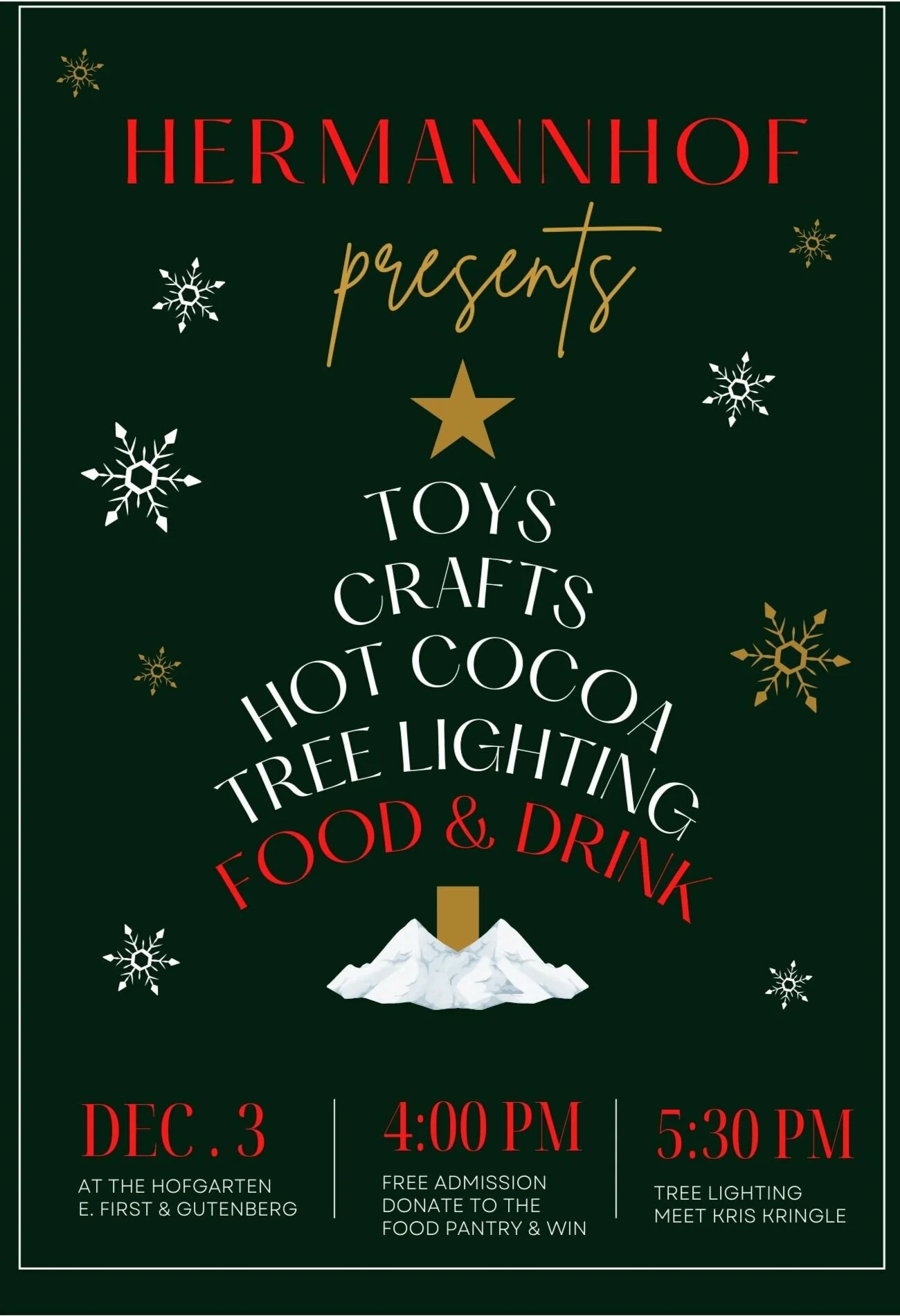Join us for Hermannhof’s annual community Christmas tree lighting. The event will take place at the Hofgarten on the corner of East First St. & Gutenberg and will begin at 4pm. The tree lighting ceremony takes place at 5:30pm, and guests will enjoy crafts, food, plus a visit from Kris Kringle. A donation of a canned good or non-perishable item will enter you to win a Christmas wreath, kids will be entered to win a free toy.